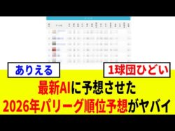 NPB最新AIが予想した2026年パリーグ順位予想が凄すぎるw 1:名無しさん@お腹いっぱい2026.01.17(Sat) This is description新AIが予想した2026年パ・リーグの順位予想をご紹介します。 チャンネル登録: ・おすすめ動画 —————————————... 2026.01.17NPB