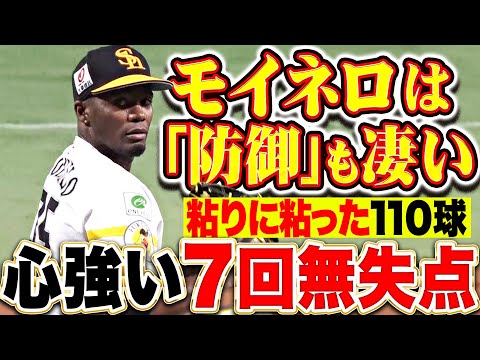 福岡ソフトバンク・モイネロは初回、先頭打者に四球を許すと、そこからノーヒットで満塁のピンチを背負う。しかし最後はファーストゴロに打ち取り無失点で切り抜ける。以降は5回まで銭湯に出塁を許し再三のピンチを背負うも、あと1本を許さず無失点。6回に初めて3者凡退に抑えると、7回も3者凡退。本来の”モイネロの攻撃”と言われるような奪三振を重ねるピッチングとはいかなかったが、要所を締めて切り抜ける投球はさすがモイネロといったところ。勝ち負けつかずも試合を作るピッチングをみせた!!