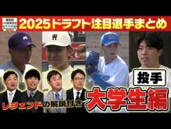 NPB【⑤ドラフト2025 大学生(投手)注目選手まとめ】ドラフト好き必見。これだけ見てればすべてが分かる!注目選手をレジェンドが解説!各球団ドラ1指名予想も!「プロ野球ドラフトちゃんねる」スカイA公式 1:名無しさん@お腹いっぱい2025.10.19(Sun) This is description■スカイA「第6回プロ野球仮想ドラフト会議」 プロ野球ドラフト会議の直前に、プロ野球レジェンドOBたちが各球団のドラフト戦略、注目選手を徹底... 2025.10.19NPB