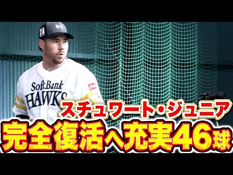 福岡ソフトバンク・C.スチュワート・ジュニアがブルペン入り!! 昨季キャンプ中に脇腹を痛め戦線離脱。4月にはリハビリのために一時帰国するなど1軍登板なしと悔しいシーズンを過ごした。完全復活へ、開幕ローテーション入りが期待される中ブルペンで投げ込んだ充実の46球。手応え十分の熱のこもった投球となった。