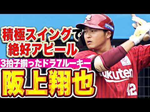 東北楽天のドラフト7位ルーキー・阪上翔也が 対外試合初打席でヒットを放つ!! 持ち前の積極性を全面に出したパワフルスイングで存在感をアピールしました!!