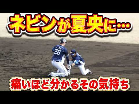 実戦形式であらかじめ走者が置かれた場面などからスタートし、さまざまなシチュエーションでチームメイトと対戦した。先日合流したばかりのネビンが右中間への一打を放ち2ベースに。塁上では思わず夏央に…!! でもわかるのだ。その気持ち。わかるのだ。