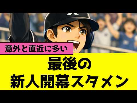 プロ野球12球団別、最後の開幕新人スタメン、意外と直近に多いNPBTwitterFacebookはてブPocketLINEコピー 2026.02.211:名無しさん@お腹いっぱい2026.02.21(Sat)This is descriptionご視聴ありがとうございます。プロ野球をはじめとした野球に関連する情報をお伝えしています。 よろしければチャンネル登録・高評価よろしくお願いします! https://www.youtube.com/@bbdaisuki【動画の内容】 2026年開幕前におけるプロ野球12球団別、最後の新人開幕スタメン選手をまとめました#12球団 #プロ野球 #開幕スタメン