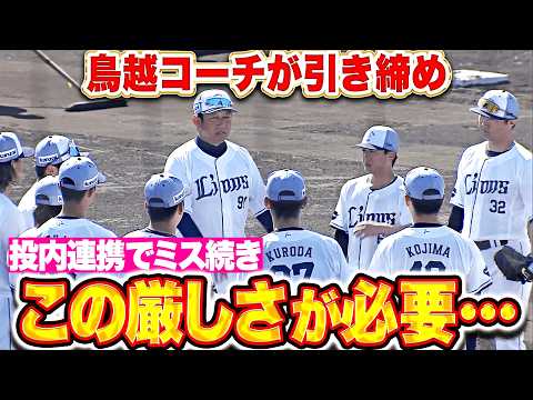 埼玉西武の投内連携中にミスが続いた場面で円陣が組まれ、鳥越裕介コーチがゲキを飛ばしてを引き締める。さらに表情が引き締まった選手たちは緊張感がある中でも良いプレーを連発!!