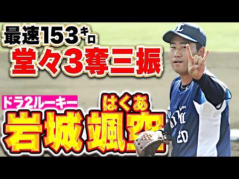 6回、4番手で登板した埼玉西武ドラフト2位ルーキー・岩城颯空。先頭打者に3球連続でボールとするも、そこから三振を奪う。さらに次の打者は3球で三振!! 次の打者には四球で出塁を許しはしたものの、最後はズバっと決まったスライダーで見逃し三振を奪う!! 昨年覇者の強力打線から1回3奪三振無失点の好投!! 勝ちパターン起用への期待が高まる投球となった!!