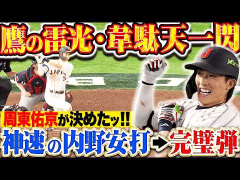 10日に行われた日本対チェコ戦、ここまで途中出場で躍動を見せていた周東佑京は7番・センターでスタメン出場。先頭で打順が回ってきた7回、見る者の度肝を抜く衝撃…ショートゴロで内野安打をもぎ取ると、牽制も掻い潜り二盗にも成功!続く8回、若月健矢の二塁打で相手の送球が乱れる間に先制のホームを踏むとなおもチャンスを広げて走者一、二塁、捉えた打球は右中間スタンドへ!! 俊足と守備だけでなくパワーもある…完璧な3ランで勝負を決めて見せた!!