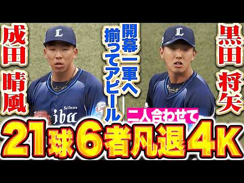6回、3番手で登板した埼玉西武・成田晴風。先頭をインコース低めに攻め空振り三振に抑えると、続く打者はストレートがズバリと決まり見逃し三振!! 最後はファーストゴロに打ち取り3者凡退!! 8回に登板した黒田将矢は先頭を3球三振に抑えると、続く打者をセンターフライ。最後はストレート攻めで空振り三振!! 今季のブルペンを支えてくれるであろう若き2人が揃って1回無安打2奪三振の好投となった!!