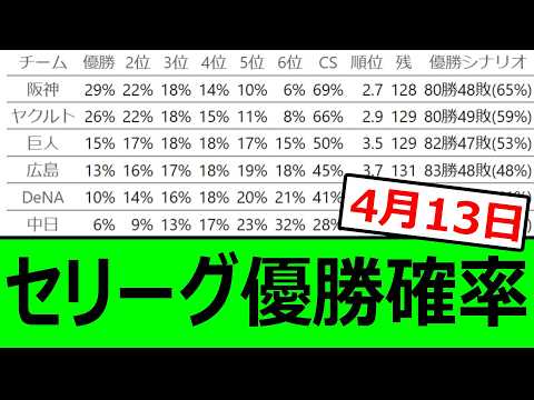セリーグ優勝確率【4月13日】【プロ野球、なんj、反応集】【野球、2ch、まとめ】【セ・リーグ順位表】#巨人 #阪神 #DeNA #中日 #広島 #ヤクルト #セリーグパリーグ優勝確率【4月13日】