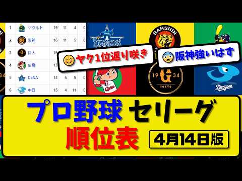 【最新】プロ野球セ・リーグ順位表 4月14日版|ヤク5-3横浜|中日6-2広島|阪神3-4巨人|【まとめ・なんJ・2ch】NPBTwitterFacebookはてブPocketLINEコピー 2026.04.151:名無しさん@お腹いっぱい2026.04.15(Wed)This is description#順位表 #阪神タイガース #読売ジャイアンツ #広島カープ #横浜DeNAベイスターズ #中日ドラゴンズ #ヤクルトスワローズ #プロ野球