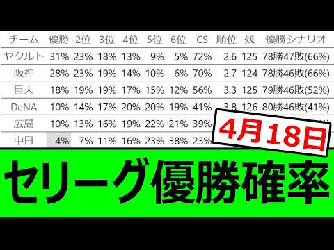 セ・リーグ優勝確率【4月18日】【プロ野球、なんj、反応集】【野球、2ch、まとめ】【セリーグ順位表】