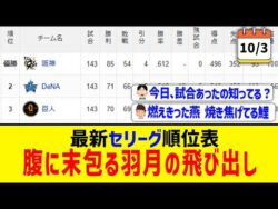 NPB【10月3日】最新セリーグ順位表 ~腹に末包る羽月の飛び出し~ 1:名無しさん@お腹いっぱい2025.10.04(Sat) This is description#阪神タイガース #読売ジャイアンツ #広島カープ #横浜DeNAベイスターズ #東京ヤクルトスワローズ #中日ドラゴンズ #プロ野球ニュー... 2025.10.04NPB
