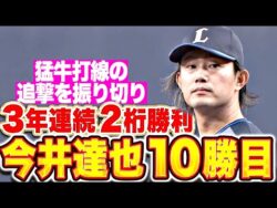 NPB【リード守り切る】今井達也『猛牛打線の追撃を振り切り…今季10勝目で3年連続の二桁勝利!!』 1:名無しさん@お腹いっぱい2025.10.03(Fri) This is description埼玉西武・今井達也は初回、四球で出塁を許すも無失点の立ち上がり。本調子とはいかずも力強い打線の援護を受け6回を投げ切る。4失点と猛牛打線に追... 2025.10.03NPB