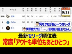NPB【9月28日】最新セリーグ順位表 ~常廣「アウトも単位もあとひとつ」~ 1:名無しさん@お腹いっぱい2025.09.29(Mon) This is description#阪神タイガース #読売ジャイアンツ #広島カープ #横浜DeNAベイスターズ #東京ヤクルトスワローズ #中日ドラゴンズ #プロ野球ニュー... 2025.09.29NPB