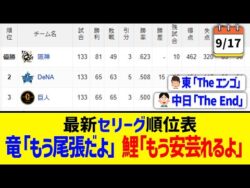 NPB【9月17日】最新セリーグ順位表 ~竜「もう尾張だよ」鯉「もう安芸れるよ」~ 1:名無しさん@お腹いっぱい2025.09.18(Thu) This is description#阪神タイガース #読売ジャイアンツ #広島カープ #横浜DeNAベイスターズ #東京ヤクルトスワローズ #中日ドラゴンズ #プロ野球ニュー... 2025.09.18NPB